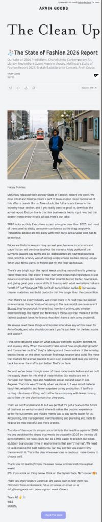 This ARVIN GOODS email, titled “The Clean Up,” is a high-value content blast sharing the “State of Fashion 2026 Report”.