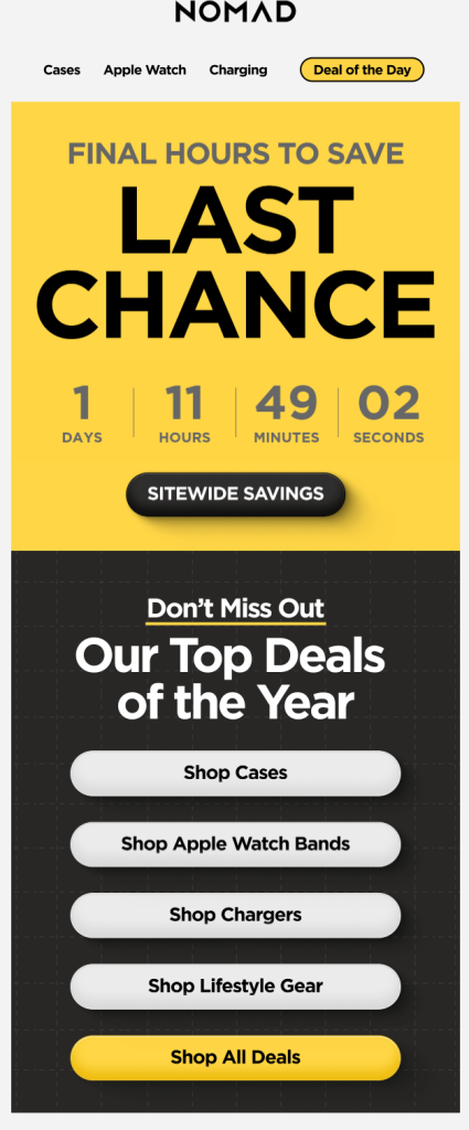 - Reinforce urgency: Use time-sensitive language like “Final Day,” “Limited Stock,” or a countdown timer for sales promotions to motivate immediate clicks.