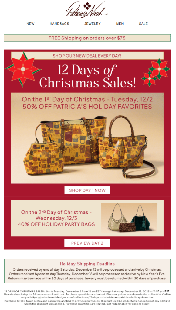 This Patricia Nash mass email campaign announces a “12 Days of Christmas Sales” event, structuring the campaign into daily deals.